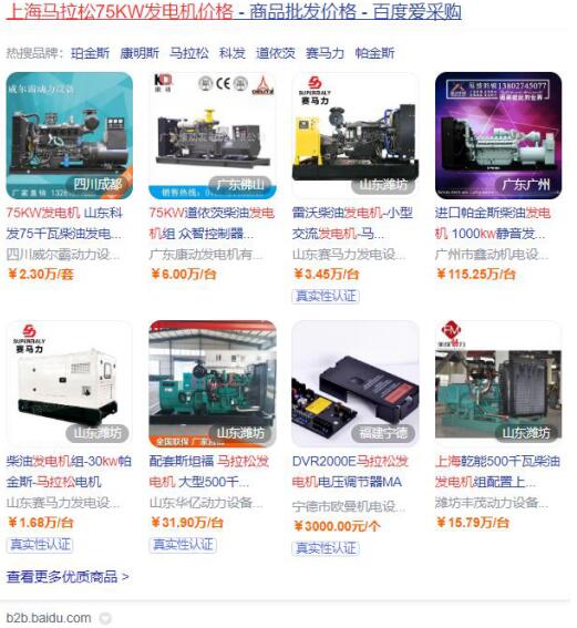 1、在百度愛采購中大家可以看到,價格低的上海馬拉松75KW發電機是1.68萬元-3.45萬元,圖中顯示馬拉松發電機功率是比較低的。