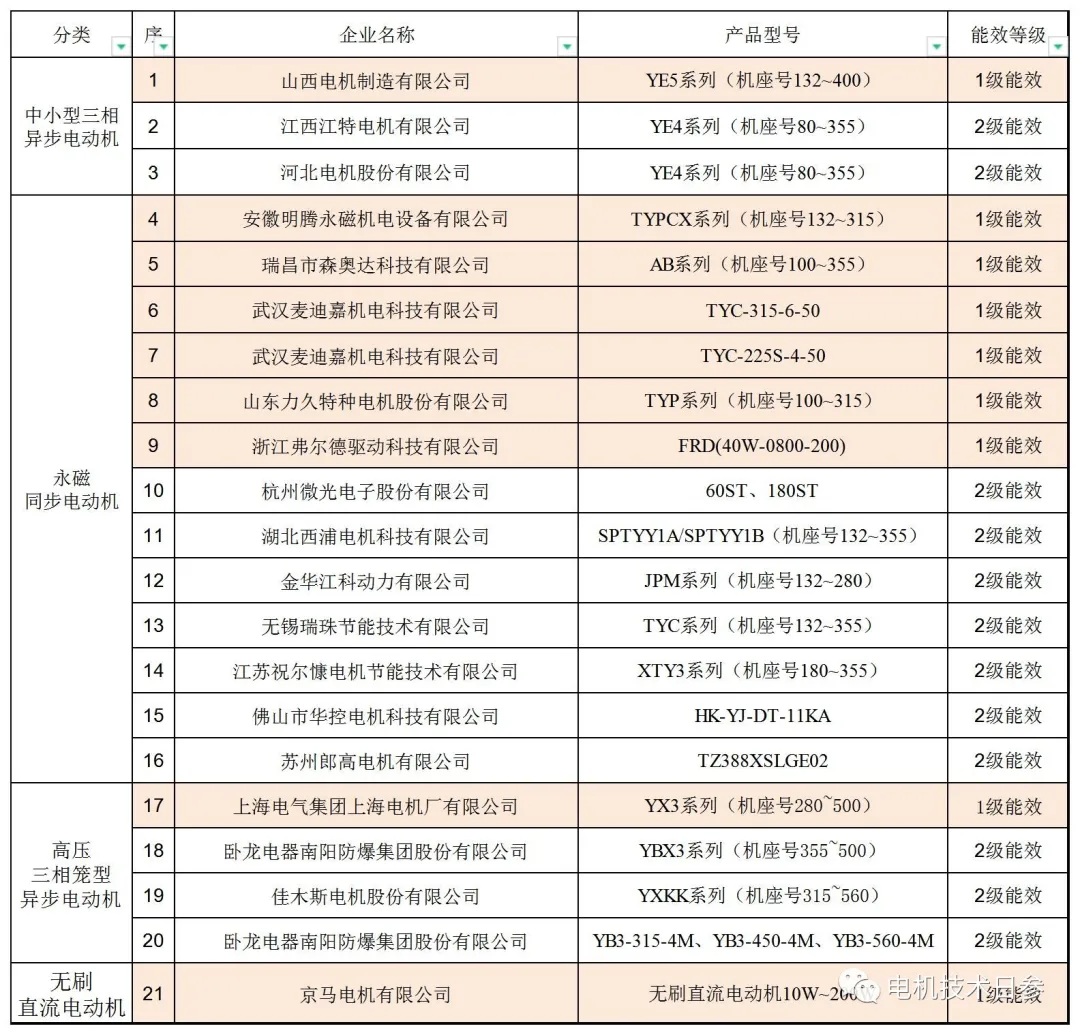 “能效之星”設備產品目錄中有21款電機產品,眾多電機廠商上榜。詳見下圖。產品涉及的電機有四種:中小型三相異步電機、永磁同步電機、高壓三相籠型三相異步電機和無刷DC電機。電機各段考核標準不同,同一能效等級效率值不同。