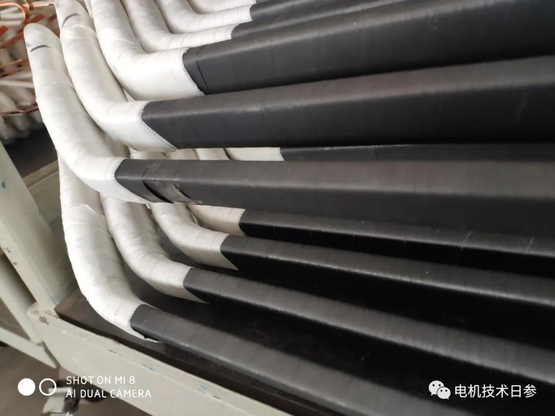 為了加強電機絕緣的絕緣性能,避免高壓電機運行時的電暈問題,先包云母材料,再包電阻帶。線圈的直線側用低止動帶包裹,而線圈的末端用高止動帶包裹。包扎過程中,必須將高阻帶和低阻帶的界面控制到位,避免包扎空缺。纏繞在線圈上的電阻帶可以有效改善線圈與鐵芯的接觸,減小線圈與鐵芯的間隙,對云母絕緣材料起到一定的保護作用。在生產加工過程中,當線圈與鐵芯之間的間隙較大時,還應采取必要的措施進行絕緣填充。